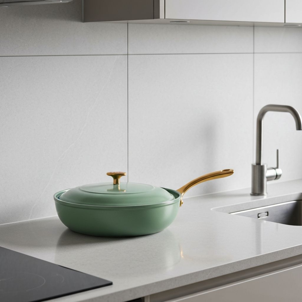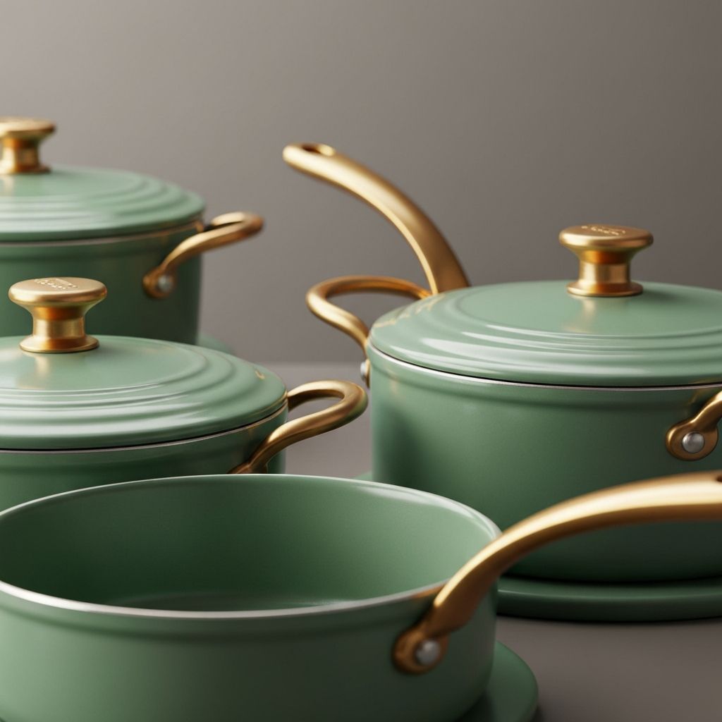 "The Drew Barrymore ceramic cookware is absolutely gorgeous and works even better than it looks! Nothing sticks, it heats evenly, and I love that it's non-toxic. The sage green color with gold handles is stunning in my kitchen."